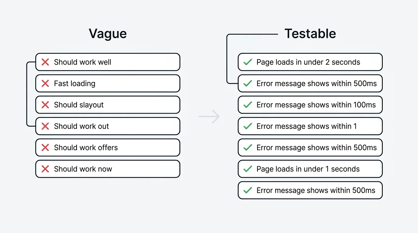 The number test: If you can replace the vague word with a number, you should. "Fast" becomes "under 2 seconds." "Reasonable" becomes "within 24 hours." "Many" becomes "up to 50."