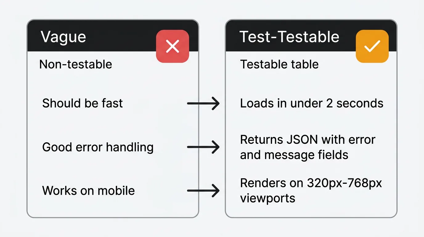 Every acceptance criterion should be binary — it either passes or fails. If a criterion requires judgment to evaluate ("the page loads reasonably fast"), it is not testable.