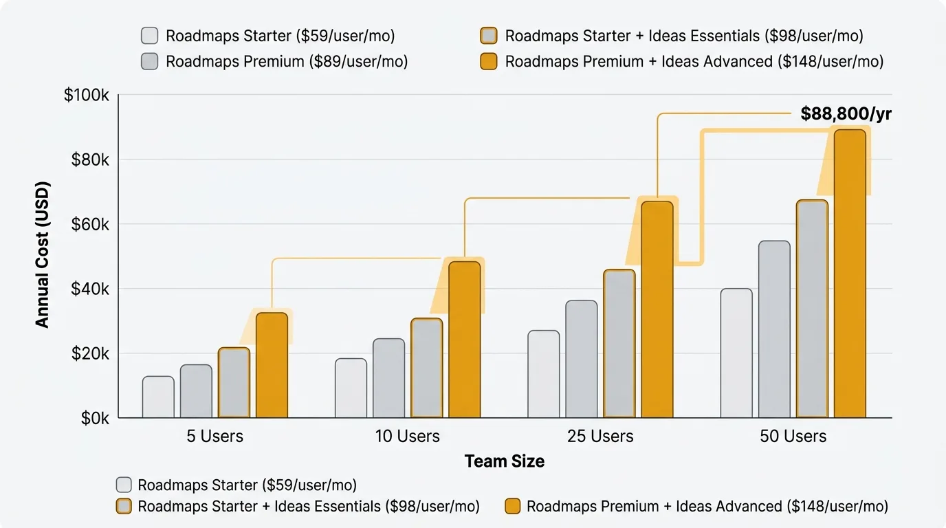 These figures use list pricing before any bundle discounts. Your actual cost with a bundle may be lower. At 25 users on Roadmaps Premium plus Ideas Advanced, the undiscounted list total is $44,400/yr. Even with a 20% bundle discount, that is $35,500/yr — a significant annual commitment.