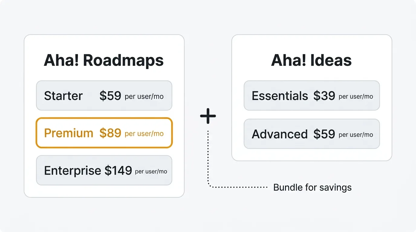 Aha Roadmaps starts at $59/user/mo (Starter), $89/user/mo (Premium), or $149/user/mo (Enterprise), all billed annually. Aha Ideas starts at $39/user/mo (Essentials) or $59/user/mo (Advanced), also billed annually. These are separate products — if you want both, you pay for both, or purchase a bundle at a discounted rate. There is no monthly billing option on any plan.