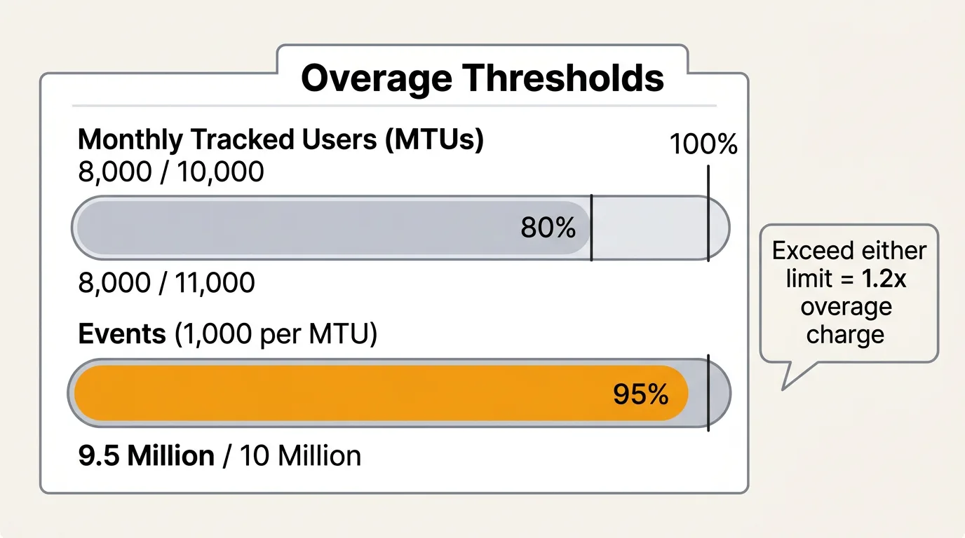 The dual constraint: This is where costs get unpredictable. A product with 5,000 monthly users who each trigger 500 events is fine on a 10,000 MTU plan (5,000 MTUs used, 5 million events used out of 10 million). But a product with 5,000 power users who each trigger 3,000 events would exceed the event cap (15 million events vs 10 million allowed) while being under the MTU limit. Both users and events can trigger overages independently.