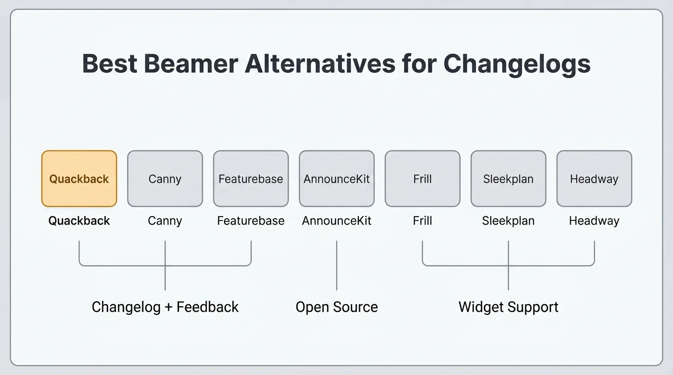 | Beamer | Quackback | Canny | Featurebase | AnnounceKit | Frill | Sleekplan | Headway | |