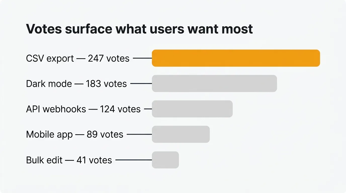 Feature voting is how product teams separate signal from noise. Instead of guessing what to build next, you let your users tell you. A voting board gives every user a voice and gives your team a quantified view of demand. The ideas with the most votes rise to the top.