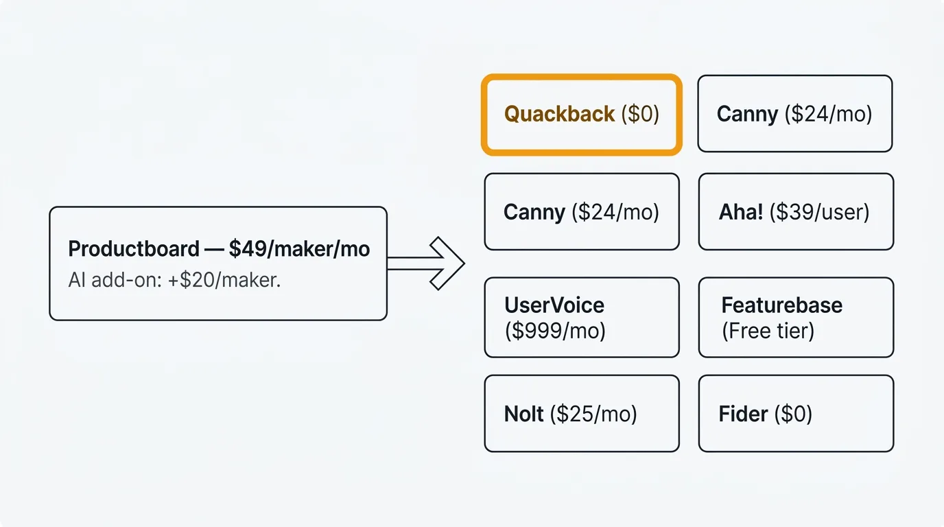 If cost is the priority: Quackback is free to self-host with no user limits. Fider is also free and open source but covers less ground. Among hosted options, Nolt ($25/mo flat) and Featurebase (free tier) are the most affordable starting points.