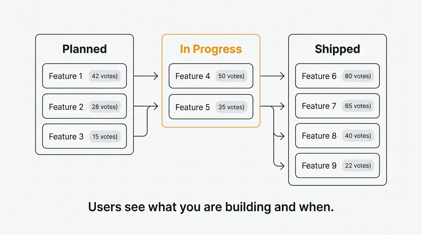 Link every item to feedback. The most effective public roadmaps show users that their feedback directly influenced what is being built. When a roadmap item links to the original feature request with 200 votes, every voter feels heard.