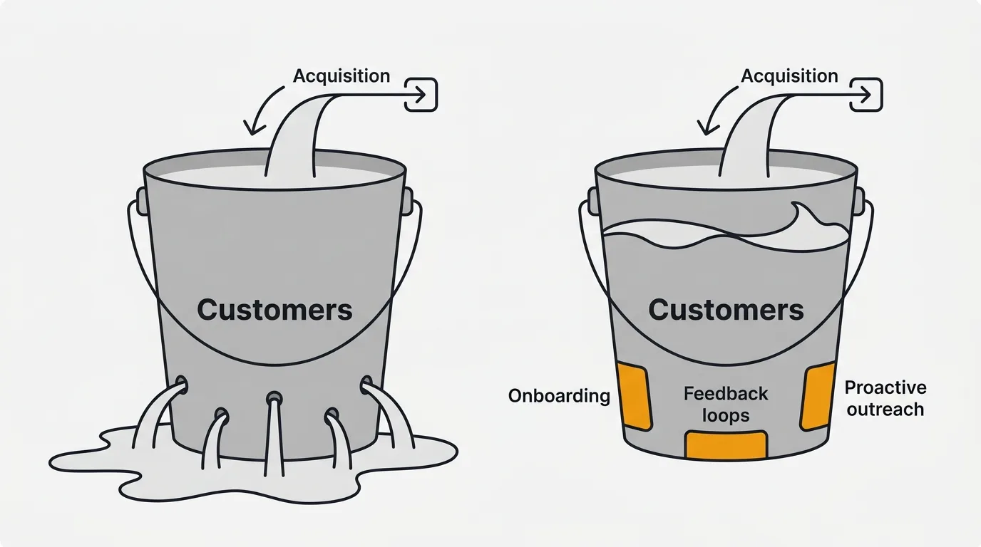 If your monthly churn exceeds 5%, investing in acquisition is filling a leaky bucket. Fix the retention fundamentals first (onboarding, feedback, health scoring), then scale acquisition. The exception is pre-product-market-fit companies that need more users to learn what to build — in that case, acquisition and feedback collection should happen simultaneously.