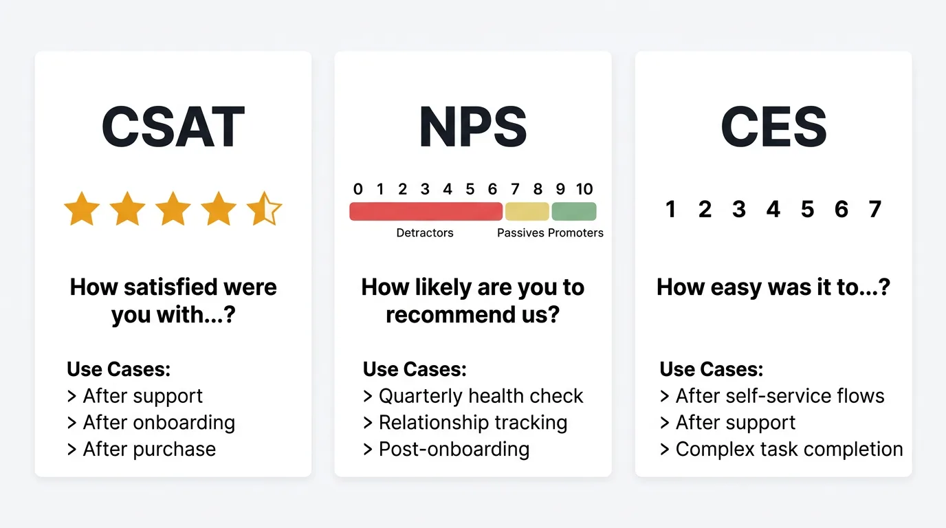 | CSAT | Satisfaction with a specific interaction | "How satisfied were you with...?" | 1-5 | After support, onboarding, feature use, purchase |