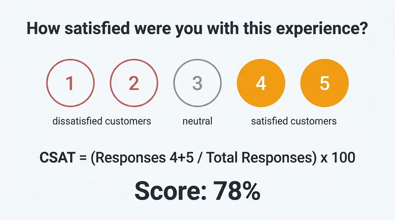 Satisfied responses are typically defined as scores of 4 or 5. If 80 out of 100 respondents gave a 4 or 5, your CSAT score is 80%.