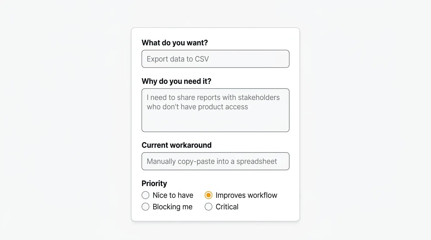 Feature requests arrive everywhere: Slack, email, support tickets, sales calls. Without a template, half of them are missing the context you need to evaluate them. A request that says "can you add dark mode" gives you almost nothing — you don't know who wants it, how many users it affects, or how it compares to everything else on your roadmap.