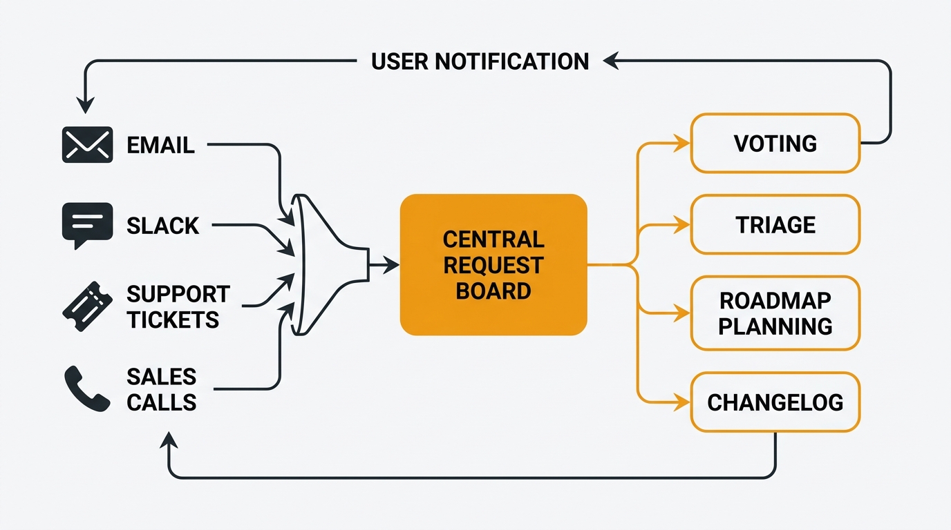 Requests need to arrive from every channel where customers talk: a public board, an in-app widget, email, support tickets, sales notes, and direct messages from the CEO. The tracking system must accept all of them without forcing anyone to learn a new workflow.