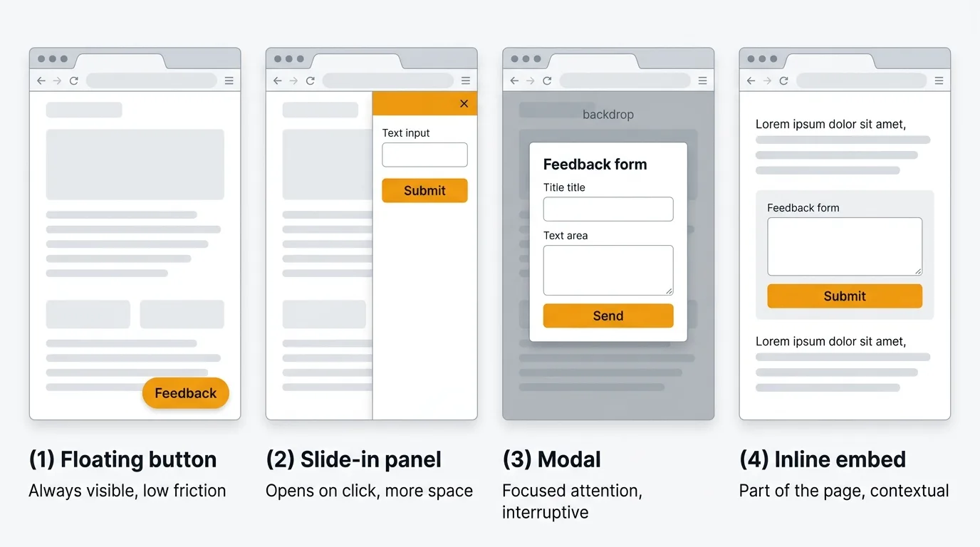 Most tools in this comparison offer at least the floating button and slide-in panel. Some add contextual triggering, screenshot capture, or integration with your existing feedback board.