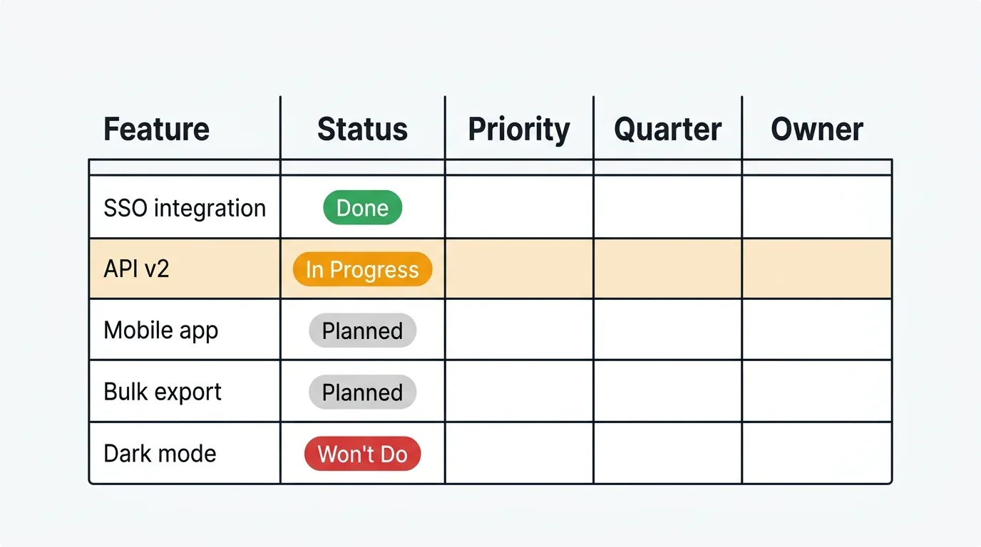 The Status column uses four values: Planned, In Progress, Done, Won't Do. These map to the actual lifecycle of a feature without introducing ambiguity.