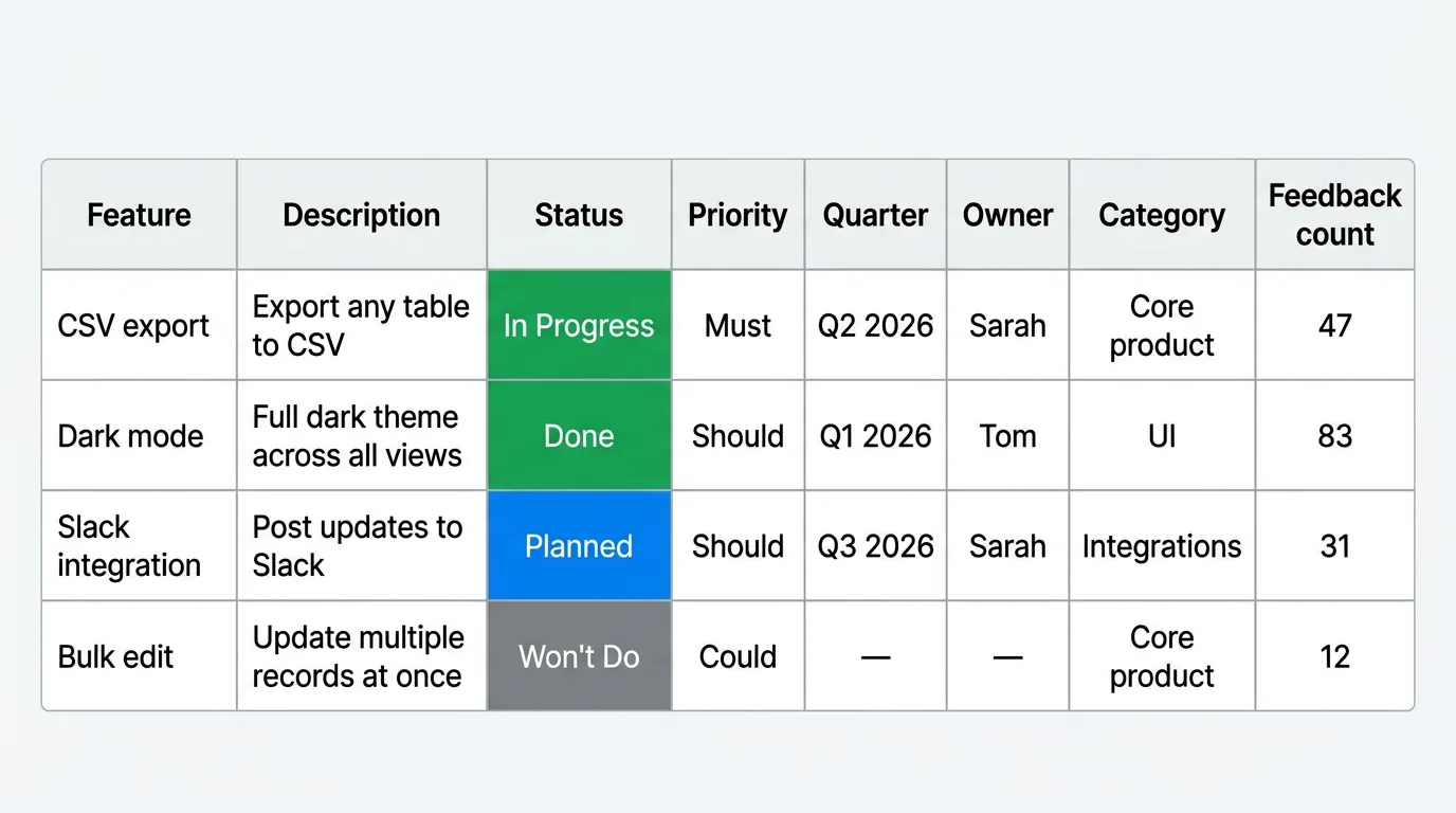 The Feedback count column is worth including even if it starts at zero. It forces you to connect roadmap items to actual user demand rather than internal assumptions. As you collect feedback, update this number. It becomes a fast signal for which items deserve more attention.
