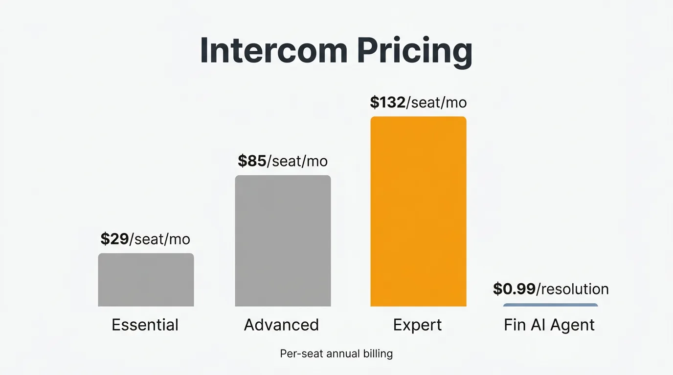 Intercom costs $29/seat/mo on Essential, $85/seat/mo on Advanced, and $132/seat/mo on Expert, all billed annually. Monthly billing is available at higher rates. Fin AI costs $0.99 per resolution on top of the base plan, regardless of which plan you are on. A 10-seat team on Advanced with moderate Fin usage (500 resolutions/month) would pay approximately $10,200/yr in seat costs plus $5,940/yr in Fin resolutions — roughly $16,140/yr combined.