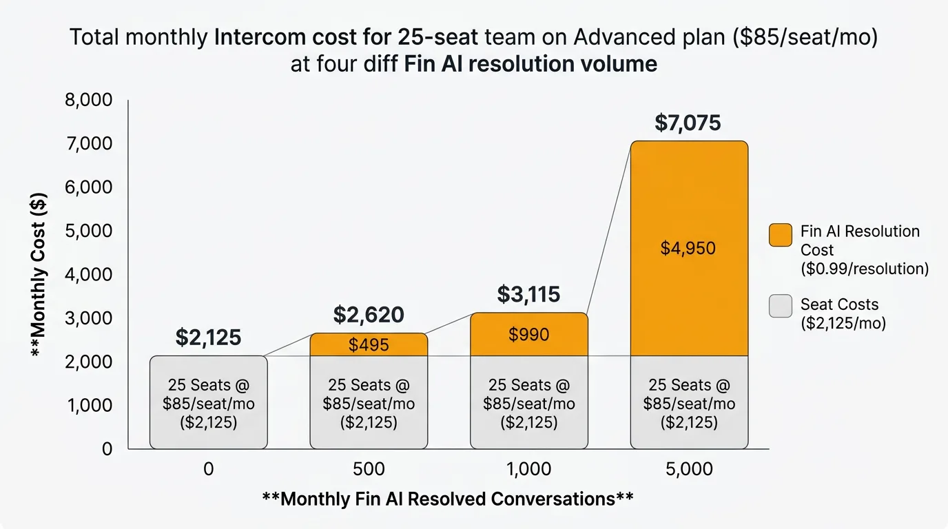 These figures cover the base plan only. Add Fin AI resolutions on top to get the full picture. At 25 seats on Advanced with 1,000 monthly Fin resolutions, your combined annual cost is approximately $25,500 (seats) + $11,880 (Fin) = $37,380/yr.