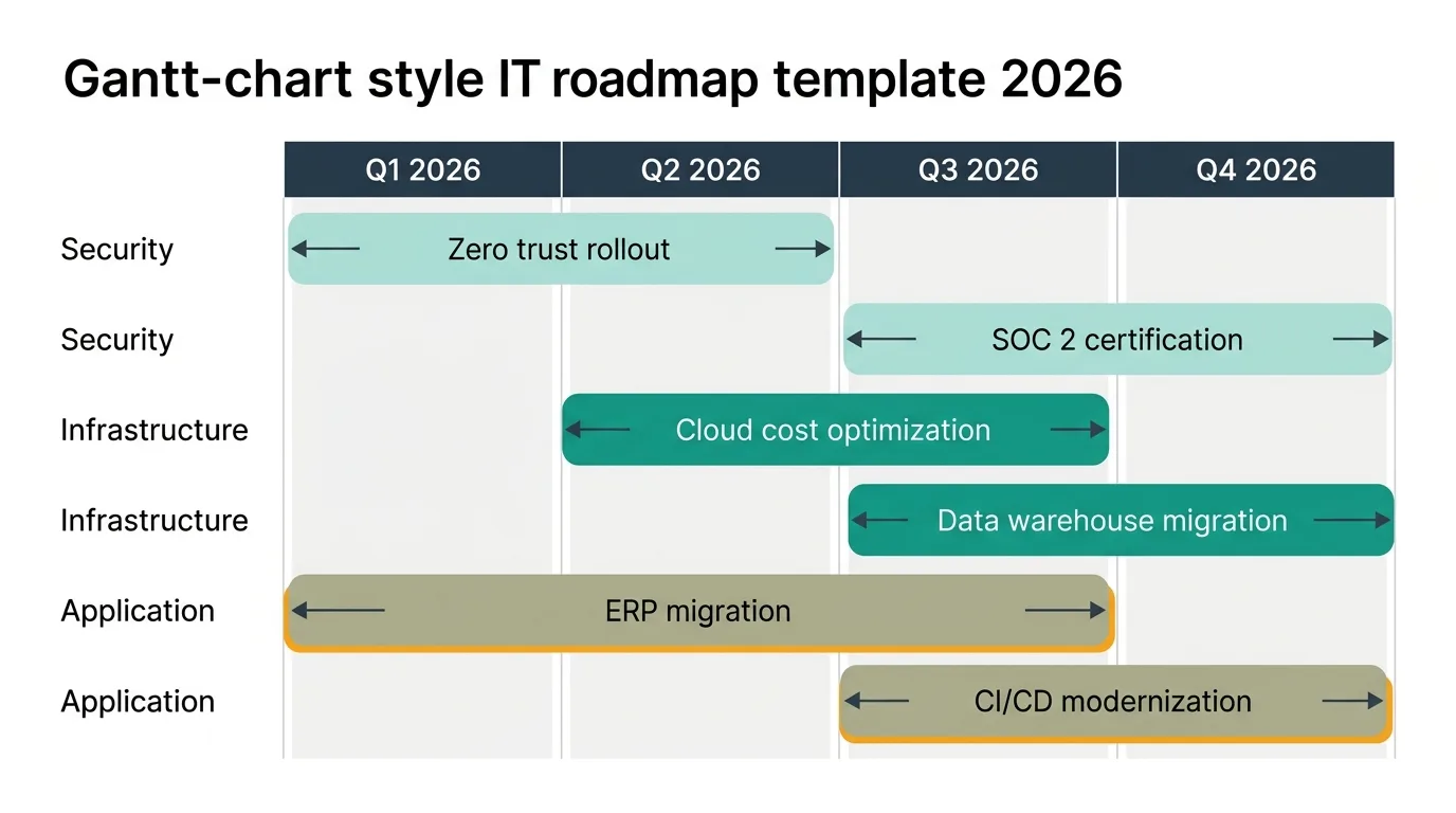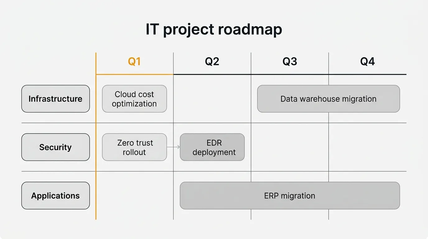 Infrastructure roadmap. Covers hardware, networking, data centers, and core systems. Typical initiatives include server refreshes, network upgrades, storage migrations, and disaster recovery improvements. Time horizons tend to be longer (12-36 months) because infrastructure changes are expensive and disruptive.