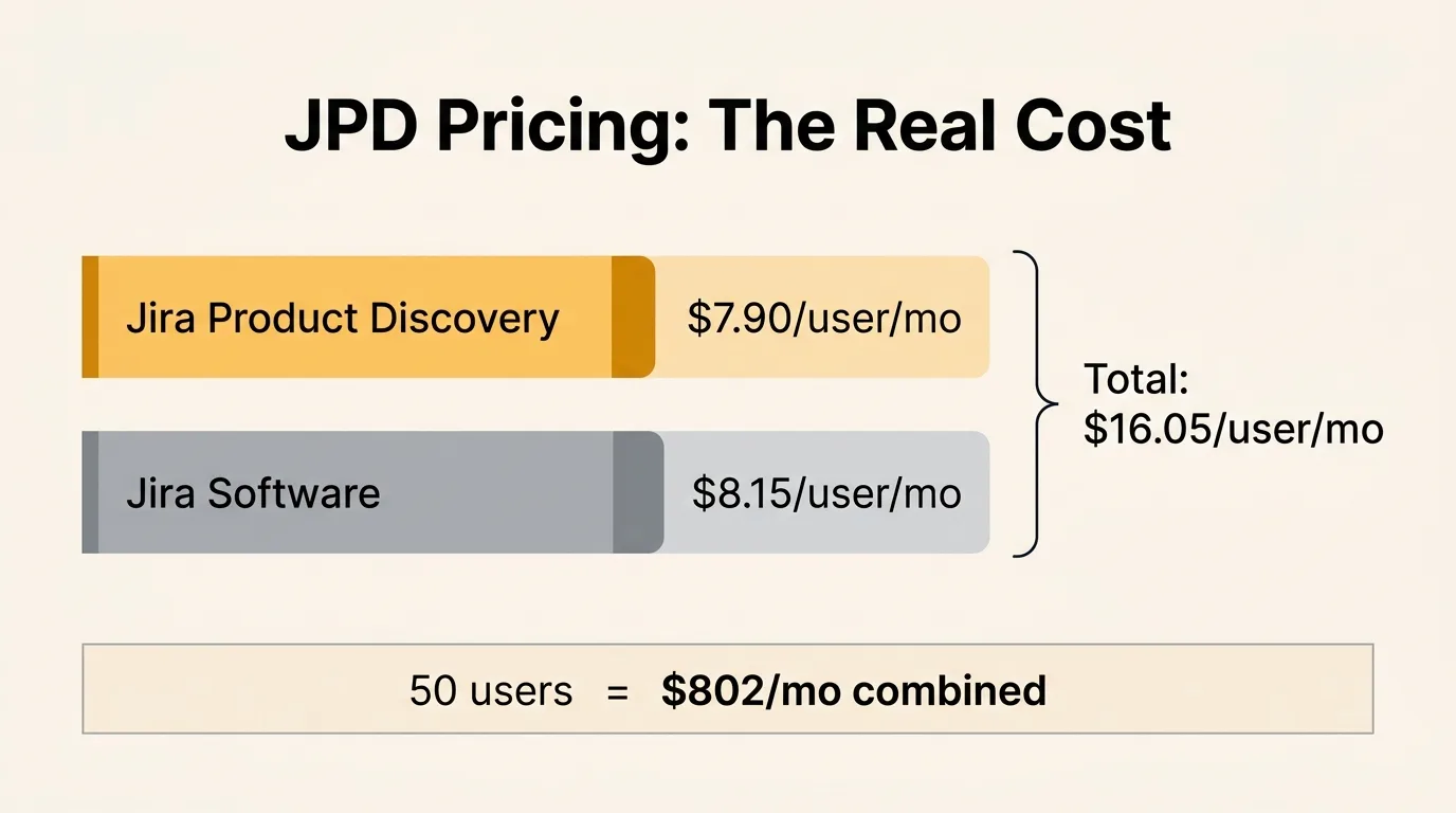 Jira Product Discovery is priced separately from Jira Software. Most product and engineering teams need both: JPD for the product management layer, Jira Software for the development backlog and sprint tracking. The delivery tracking integration — linking JPD ideas to Jira Software issues — only works if your engineering team is on Jira Software.