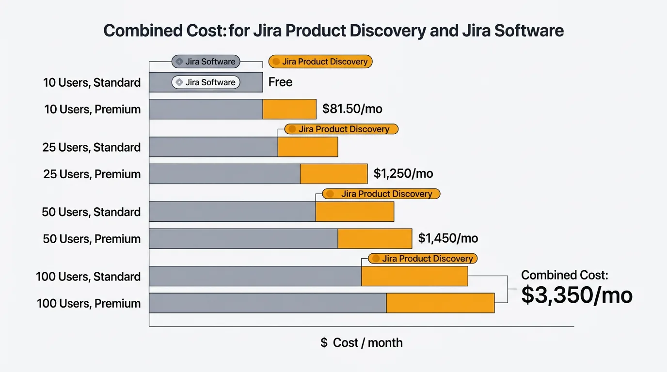 Above 10 users, JPD costs stack on top of whatever your team already pays for Jira Software. At 50 users on Standard, you're looking at roughly $800/month combined. At 100 users on Premium, the combined bill reaches $3,350/month.