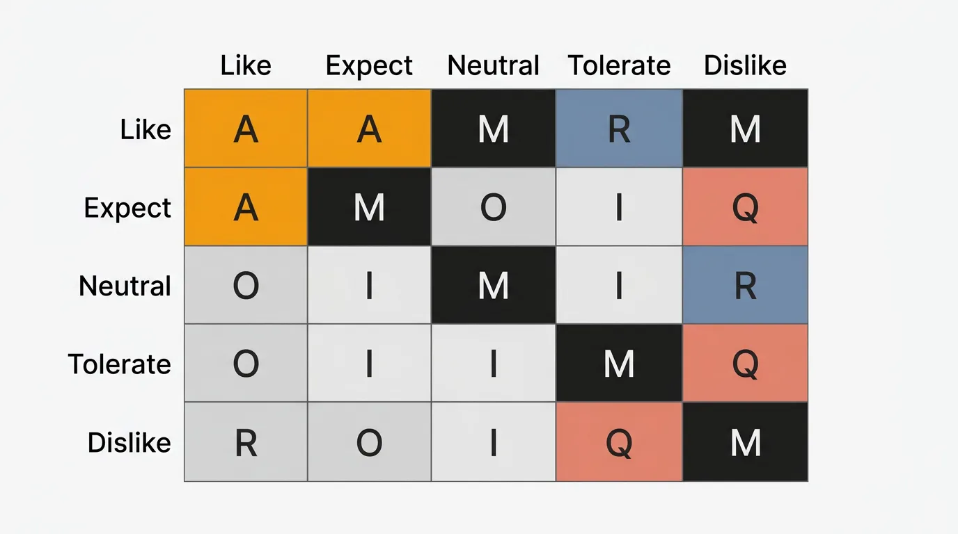 How to read it: If a customer says "I like it" when the feature is present and "I dislike it" when absent, the intersection is O (Performance) — satisfaction and dissatisfaction both track with the feature. If they say "I like it" when present but "I am neutral" when absent, that is A (Attractive) — they enjoy it but do not miss it.