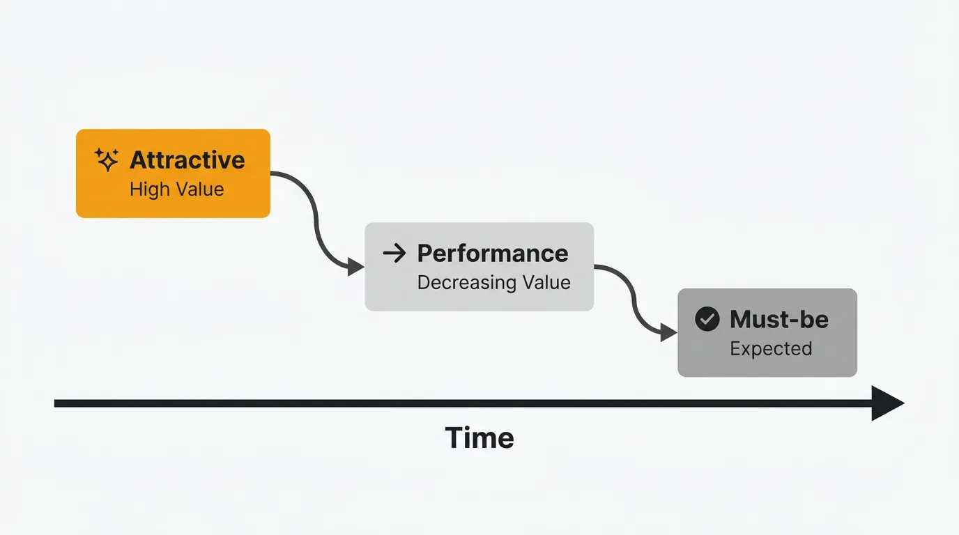 This is the most important practical implication of the Kano Model. Features follow a predictable trajectory over time: