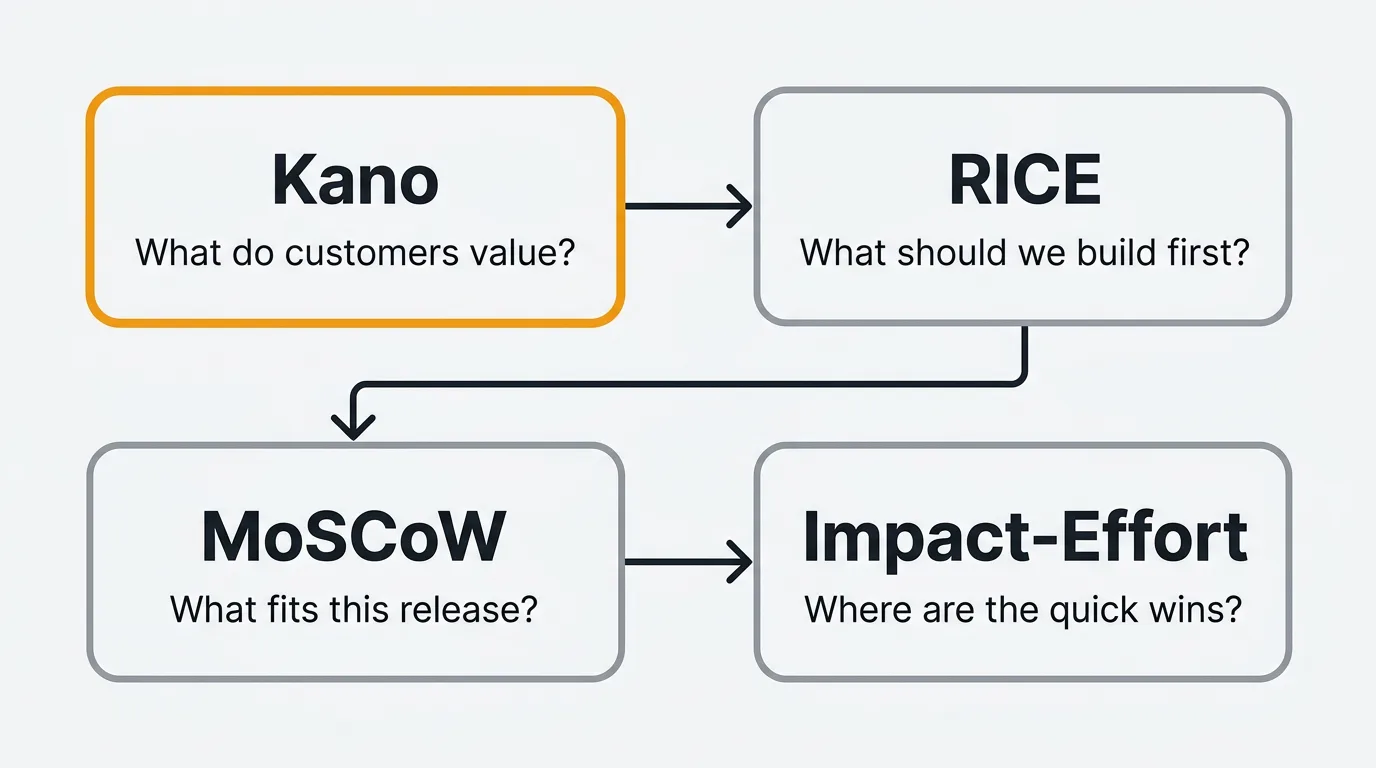 The recommended workflow: Use Kano during discovery to understand what matters. Feed Kano classifications into RICE scoring — a Must-be feature gets high Impact regardless of reach. Use MoSCoW to finalize what ships in the next sprint.