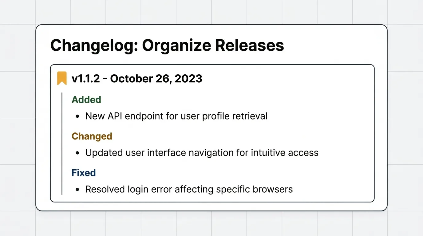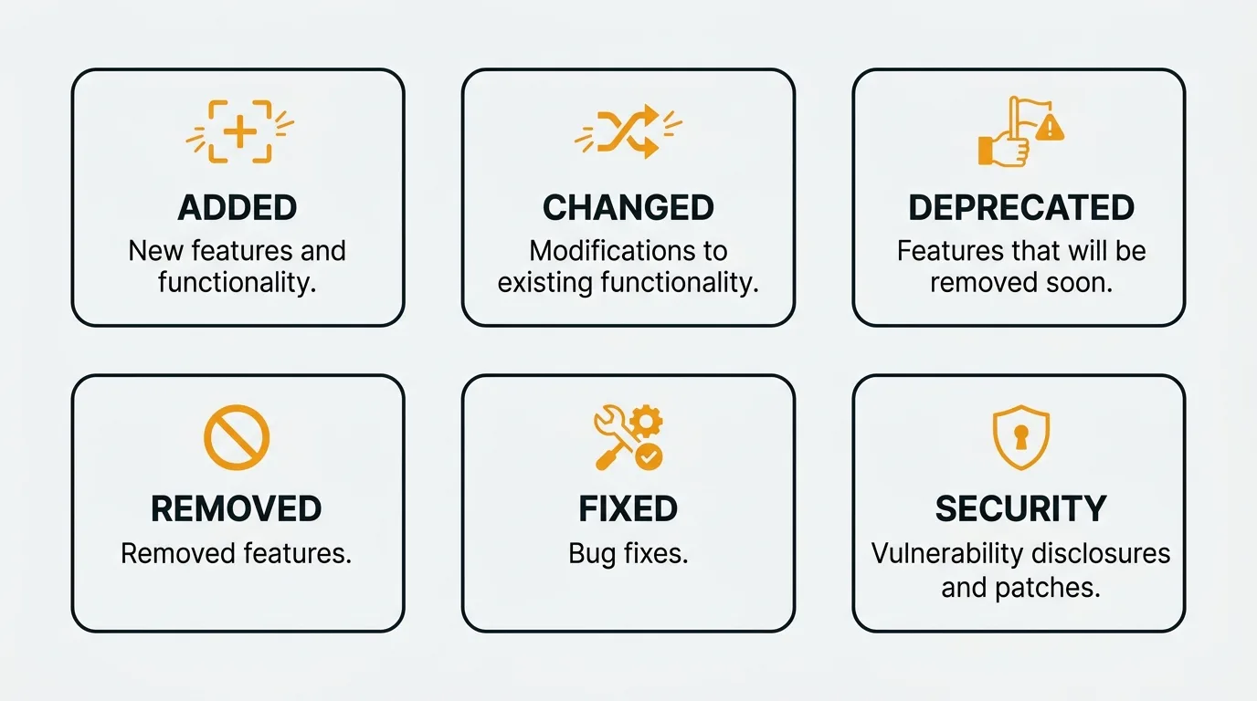 Do not mix bug fixes, new features, and deprecations in one undifferentiated list. Group them by type so users can scan for what matters to them. The Keep a Changelog format defines six standard types (covered in the next section).