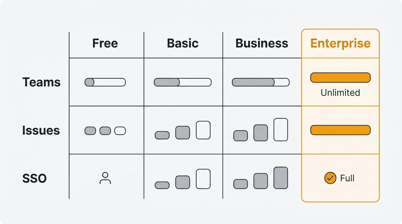 | Plan | Price (billed annually) | Members | Teams | Issues | Key Features |