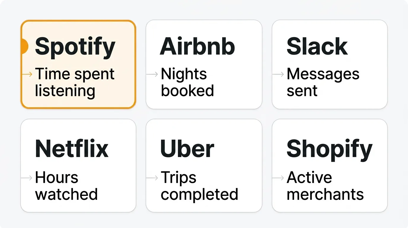 | Spotify | Time spent listening | Measures the value users receive; more listening correlates with subscription retention |