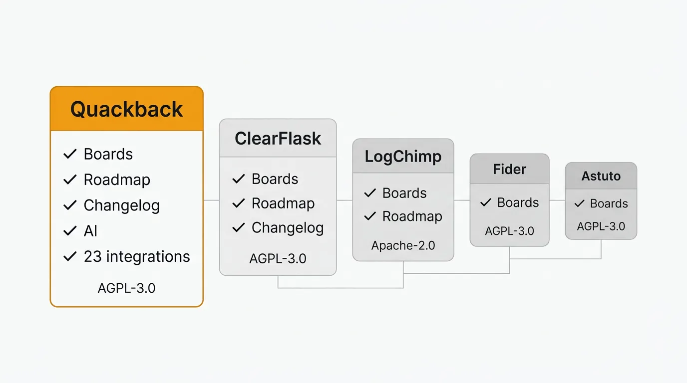 If you need the full feedback workflow: Quackback and ClearFlask are the two options that cover boards, roadmap, and changelog. Quackback adds 23 integrations, AI features, and an MCP server. ClearFlask offers credit-based voting and analytics but has a more complex setup and slower recent development. Evaluate both against your specific requirements.