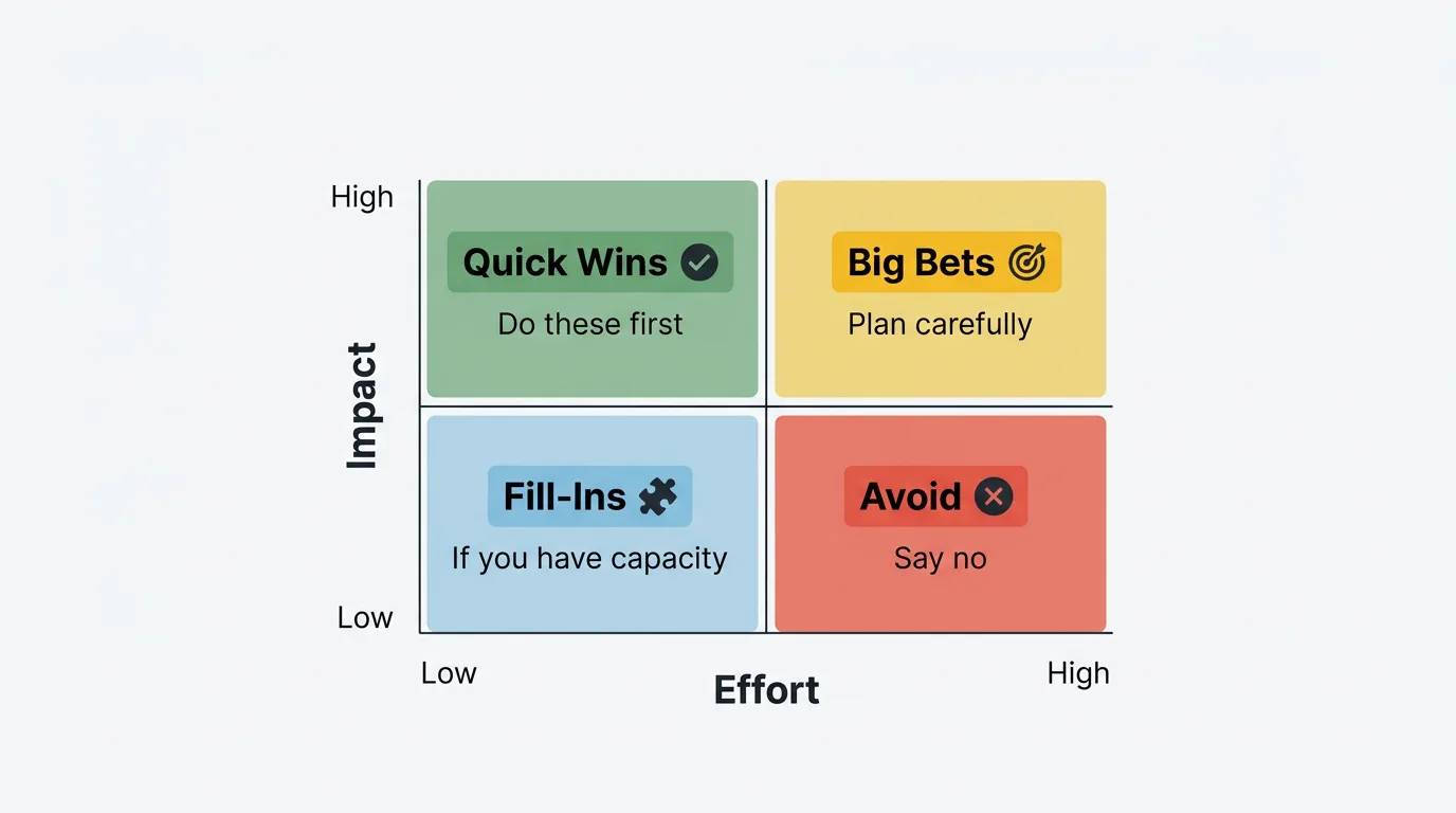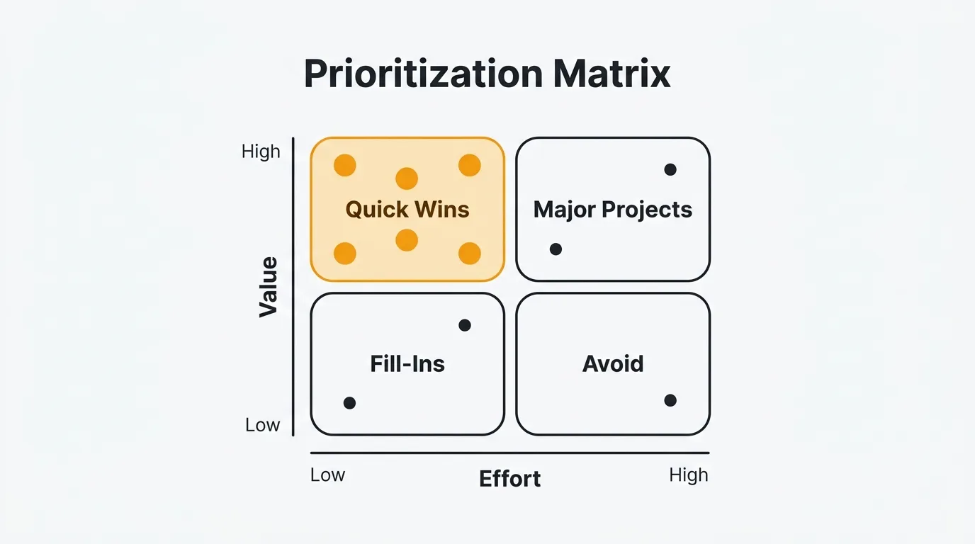 Major Projects (high value, high effort): Plan carefully. These are worth doing, but they require scoping, sequencing, and resource allocation. Don't let them crowd out Quick Wins in the short term.