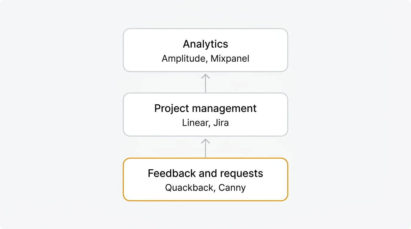 Start with feedback and project management. Pick a feedback tool that handles collection, voting, roadmapping, and changelog in one place. Pair it with Linear or Jira for issue tracking and sprint planning. An integration between the two means accepted feature requests flow into your development workflow without manual re-entry.