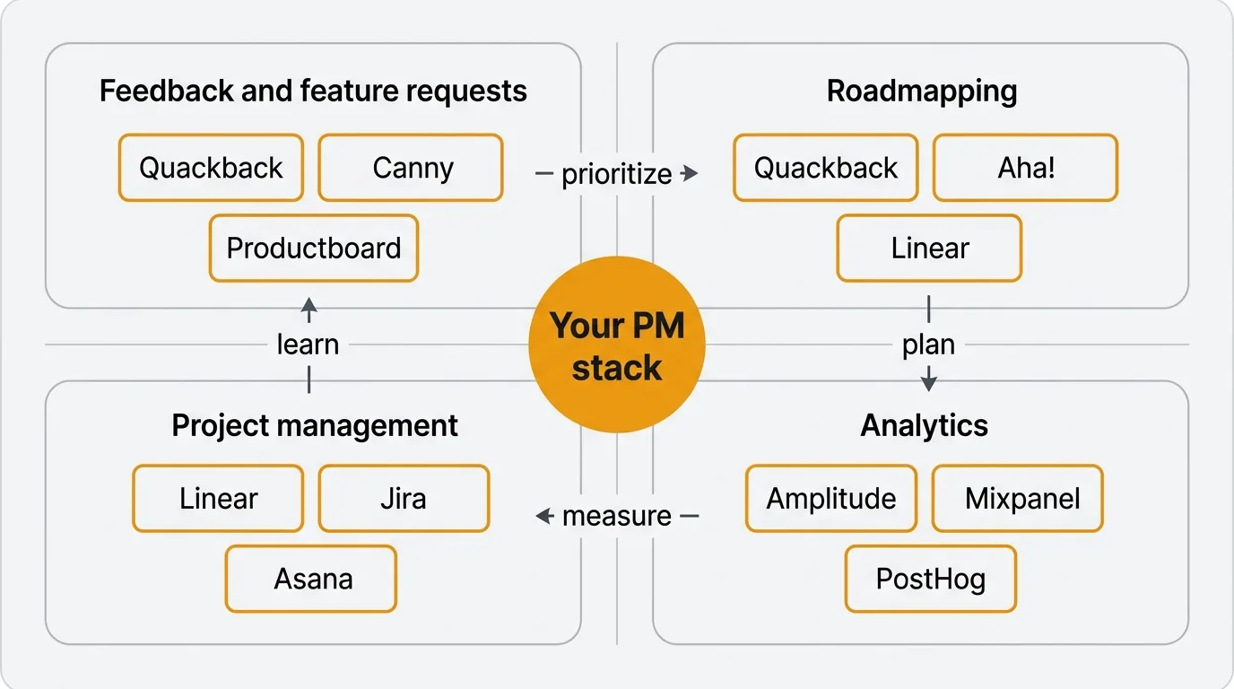 Most product managers use a combination of three to four tools daily. A feedback tool (Quackback, Canny, or Productboard) for reviewing feature requests and updating the roadmap. A project management tool (Linear or Jira) for tracking development work. An analytics tool (Amplitude or Mixpanel) for measuring feature adoption. And a communication tool (Slack or Notion) for internal alignment and documentation.