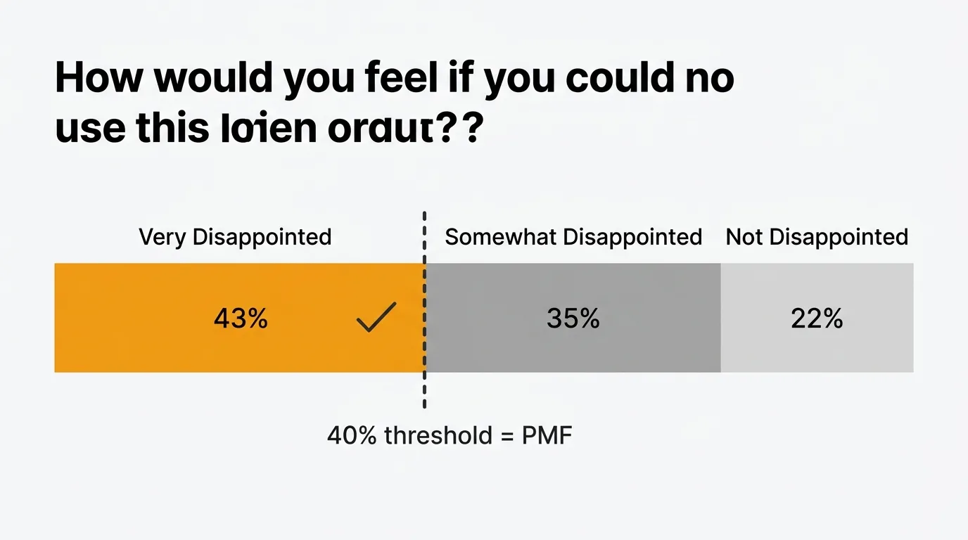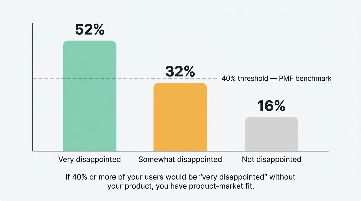 Your PMF score is the percentage of respondents who select "Very disappointed." If that number is 40% or above, you have PMF. Below 40%, you do not — at least not yet.