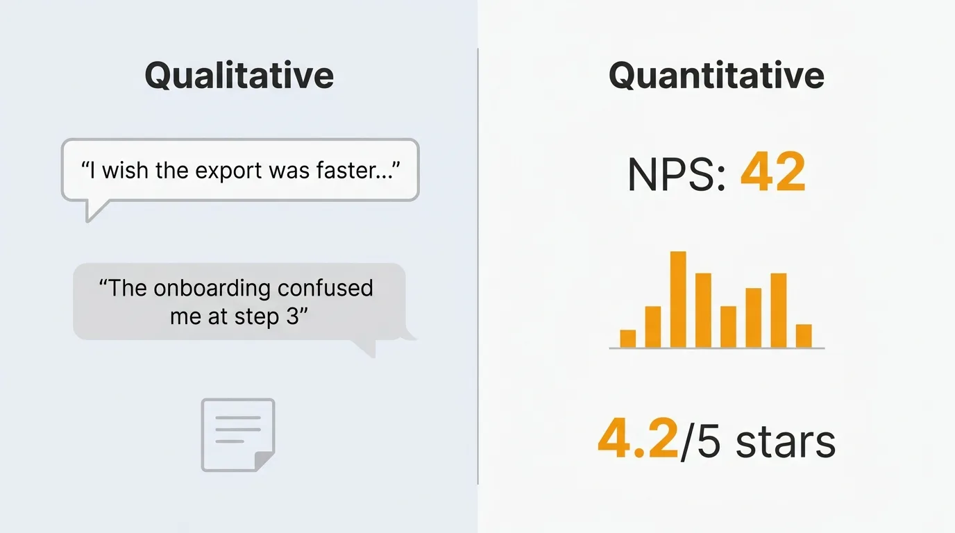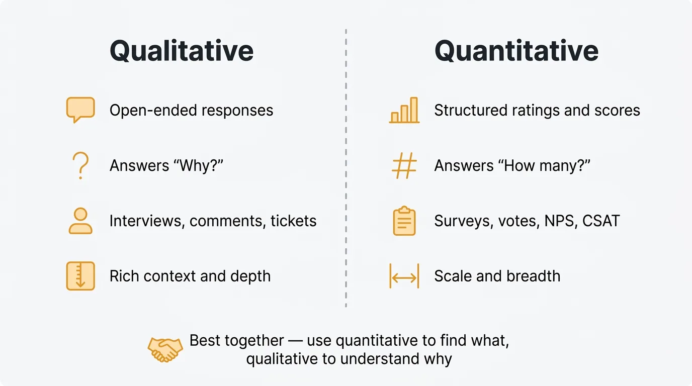 There are two types of feedback. Most product teams collect one well and neglect the other. The result is either a spreadsheet of numbers with no context, or a pile of comments with no way to gauge scale.