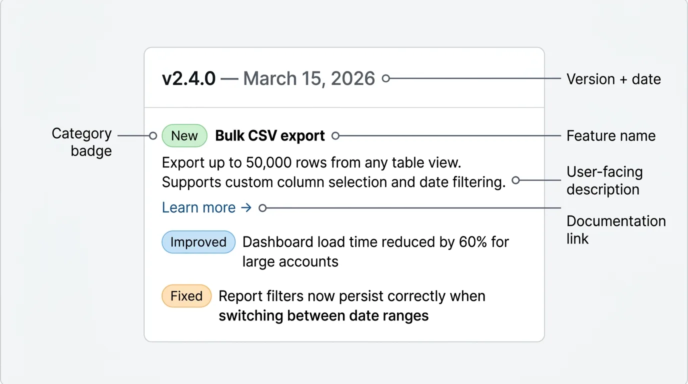 Vague claims undermine credibility. "Improved performance" tells users nothing. "Reduced dashboard load time by 60% for accounts with more than 10,000 records" tells them what changed and whether it affects them.