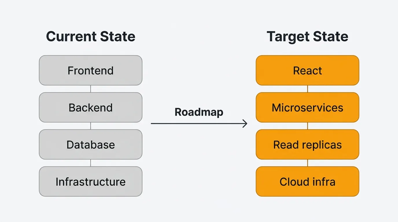 A technology roadmap is a strategic document that outlines how your technology platform will change over time. It covers decisions about your tech stack, architecture, infrastructure, and developer tooling, organized into phases with clear milestones.