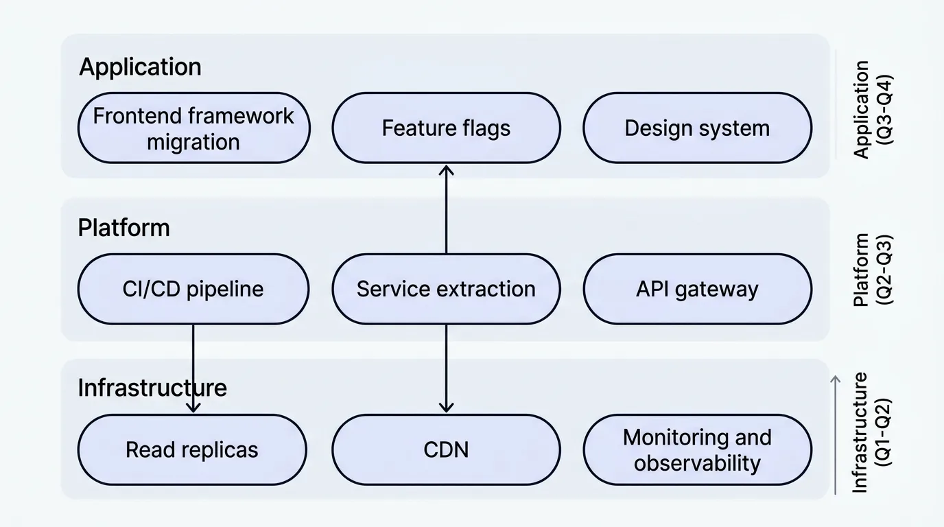 Each phase delivers a concrete improvement. Teams can ship billing changes without deploying the whole application after Q1. The monolith does not disappear in one quarter. It shrinks gradually.