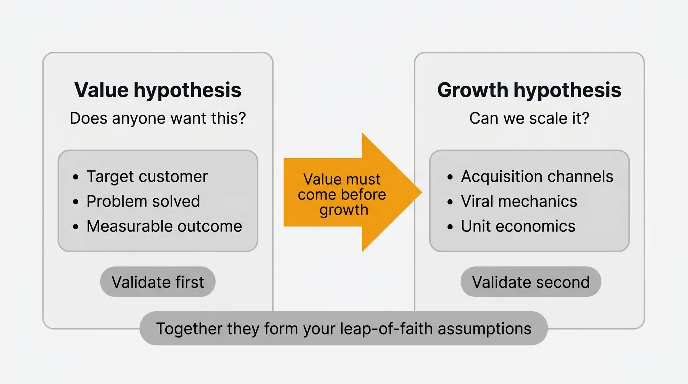 A growth hypothesis asks: can we scale it? Can we find more customers like the ones who already value it, and can we acquire them sustainably? This is only worth testing once value is confirmed.