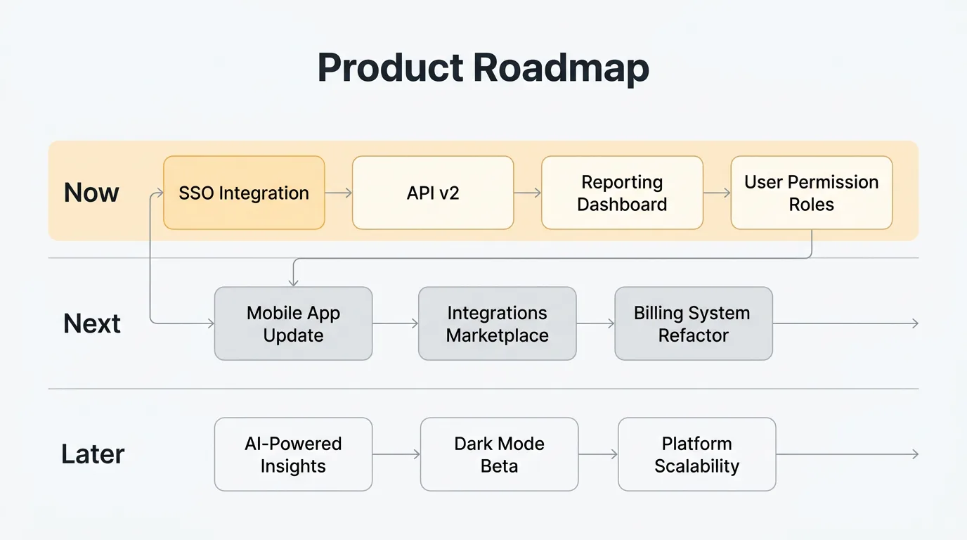 The Now/Next/Later format divides the roadmap into three columns: what the team is actively building, what they plan to build next, and what they intend to build eventually. There are no dates. No quarters. Just three buckets that reflect relative priority.