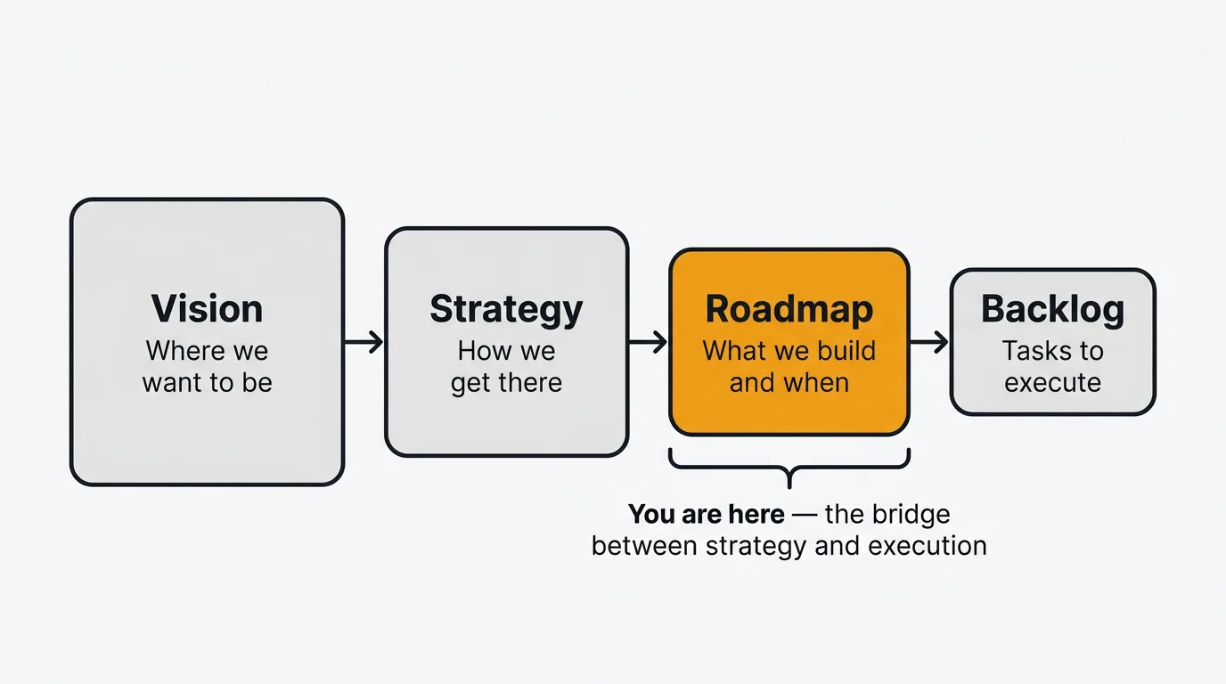 The difference between a roadmap and a backlog is worth emphasizing. A backlog is an unordered or lightly ordered collection of everything you might build. A roadmap is a curated subset of that list, organized by priority and time horizon, designed to communicate a coherent story. Showing your backlog to a stakeholder or a customer is almost never useful. Showing your roadmap is.