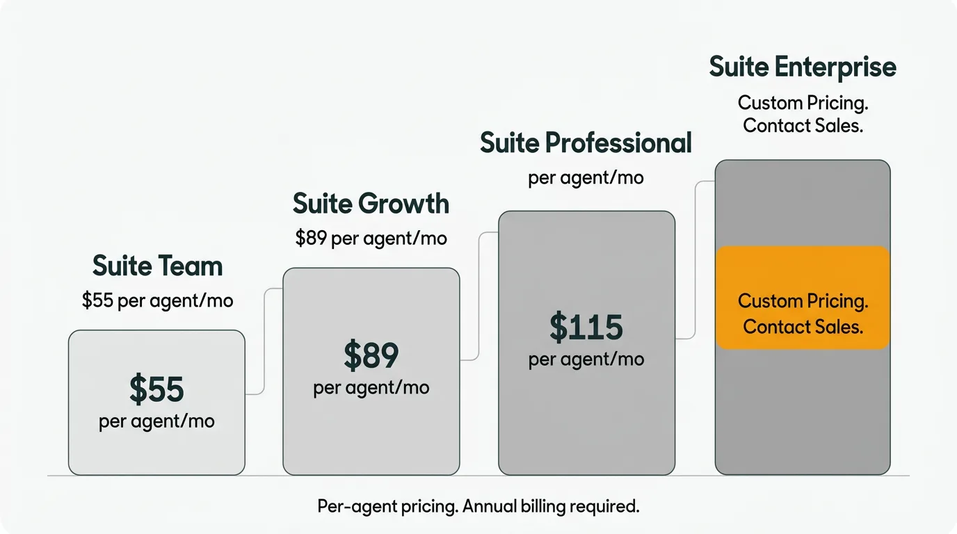 At $55/agent/month on Suite Team, a team of 10 agents costs $550/month, or $6,600/year. At $115/agent/month on Suite Professional, the same team costs $1,150/month, or $13,800/year. There is no volume discount published on lower tiers — the price per agent stays flat regardless of how many seats you add.