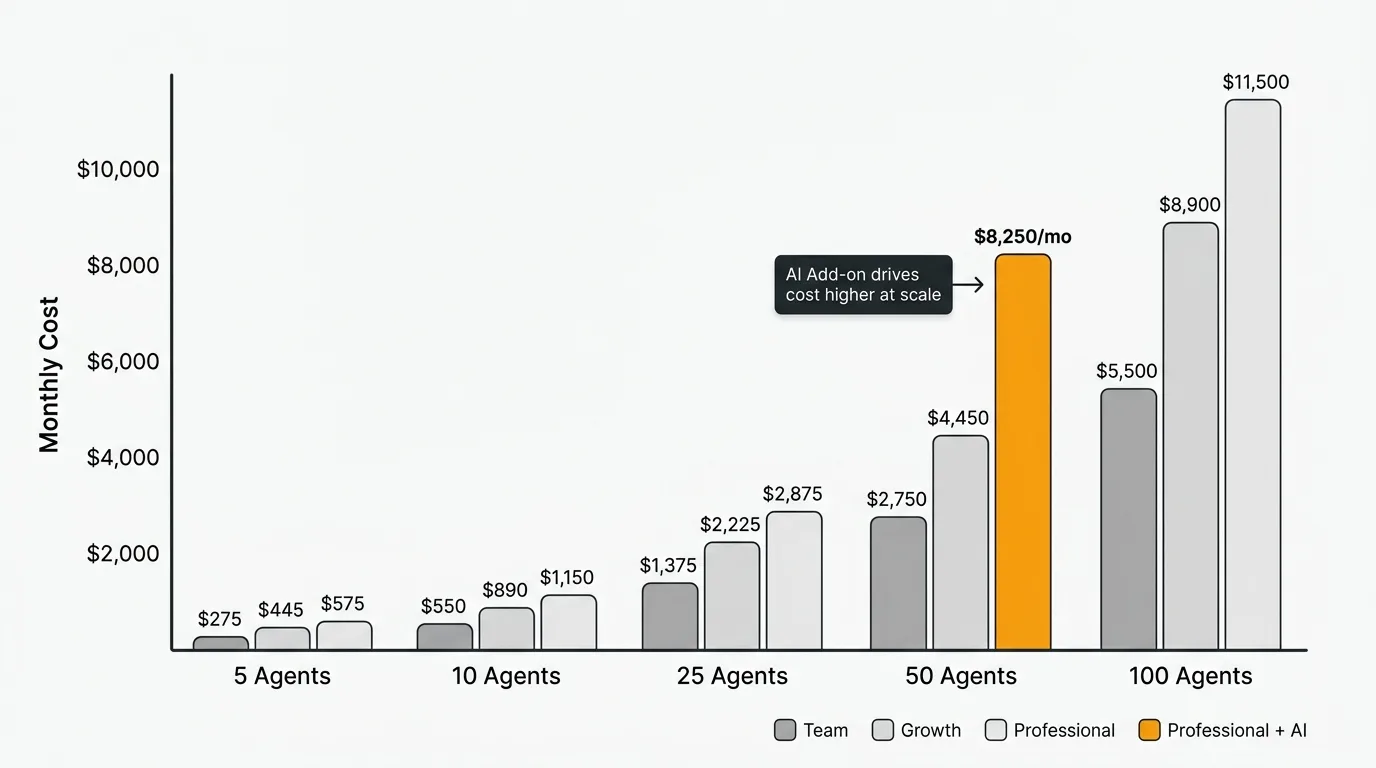 | 50 agents | $2,750/mo | $4,450/mo | $5,750/mo |